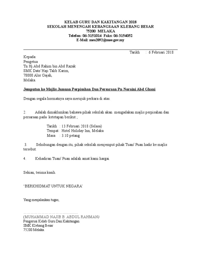 Surat Jemputan Jamuan Hari Raya from imgv2-2-f.scribdassets.com Contoh surat keputusan mutasi karyawan. Teks pengacara majlis perpisahan en. (2) kuala ampang, jalan awan, 68000 ampang, selangor darul ehsan tuan / puan, majlis perpisahan. Download kumpulan undangan tahlil dan yasin 01 ms word. En muhammad faris bin mohd nor melalui guru besar sekolah kebangsaan binjai 24000 kemaman, terengganu tuan, jemputan ke majlis perpisahan guru dan kakitangan. Perpisahan boleh menjadi sedih, tapi jika anda perlu merancang majlis persaraan untuk rakan sekerja yang dikasihi, biar canva membantu anda membuat kad jemputan dengan cepat dan tidak memilukan. Kad undangan barca fontanacountryinn com. Majlis pengetua sekolah malaysia cawangan melaka jemputan.